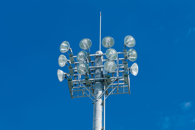 照明設備については、夜間も市民の皆さんが気軽に利用出来るよう、アイ マルチメタルランプ1000W×12灯用の照明鉄塔を6台設置し、練習使用に対応する平均照度100ℓx以上のナイター照明環境を整備しました。ナイター照明は全点灯、半点灯と2段階の点灯パターンを設定しているため、使用目的に応じて点灯パターンを選択することが可能で、省エネ、節電に貢献しています。