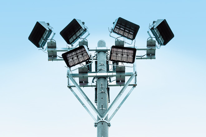 また、メインスタンドの上に設置されていた投光器を更新し、「レディオック フラッド ゼスト シンプルモデル 500クラス」をトータルで12台設置しました。これまでと同等以上の照度を確保しつつ、メタルハライドランプ1000W相当の明るさを持つ500クラスは省エネにも貢献し、地元の皆さまに多目的に利用されている陸上競技場を明るく快適に照らしています。