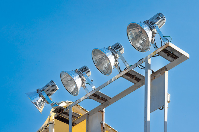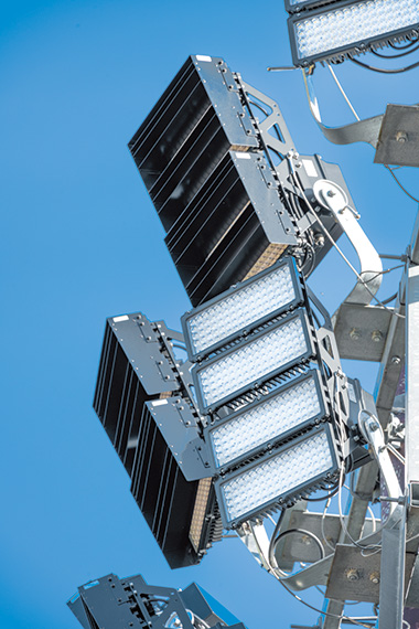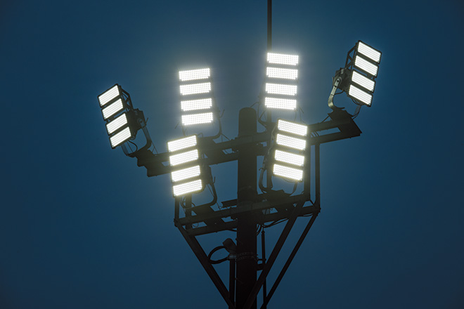 かほく市では、2023年10月に夜間照明設備の改修工事を行い、ナイター照明のLED化を実施しました。照明更新にあたっては、同陸上競技場が丘陵地に位置し、周辺には田畑が広がっていることから、周辺環境への光害には特に配慮のうえ、照明器具を選択することが重要でした。そのため、「漏れ光対策ルーバ」の取付けが可能な高効率形LED投光器「レディオック フラッド アヴァン」シリーズをご提案し、メタルハライドランプ1500W相当の明るさをもつ700クラスをご採用いただきました。各器具の角度を詳細に調整するとともに、必要な箇所には漏れ光対策ルーバを使用し、周囲への漏れ光を低減した良好なナイター照明環境を実現することができました。