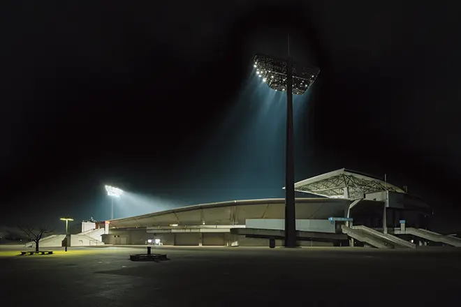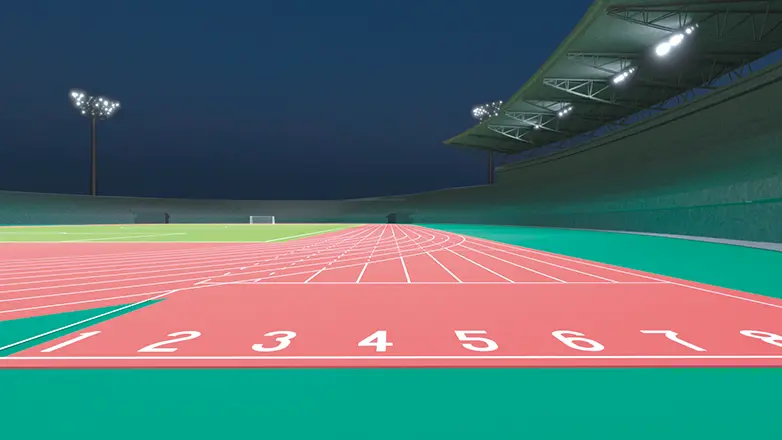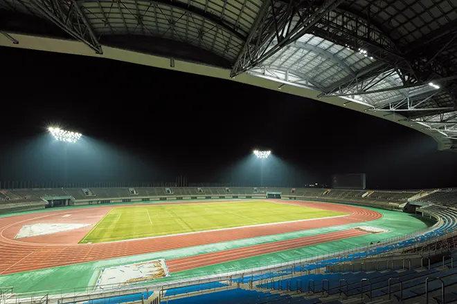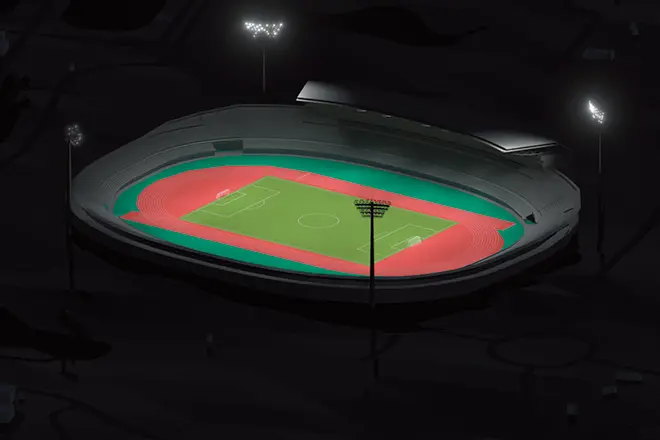 埼玉県では、2025年3月、陸上競技場の照明設備改修工事を実施し、既設HID投光器をLED照明に更新しました。近隣に住宅地や農作業地があることから、特に光害に配慮のうえ、4基の照明鉄塔にはLED投光器「レディオック フラッド アヴァン 光害対策形 1300クラス」をご採用いただきました。上空や周囲への漏れ光を抑制しつつ、競技に適した良好な照明環境を提供しています。また、スタンド上にLED投光器「レディオック フラッド デュエル 1500Wタイプ」を設置して陸上競技場を明るく照らし、十分な照度を確保しています。照明設計にあたっては、3DCGと照明環境シミュレーションシステム「iVR-360」を活用し、VR空間上でスタジアム内と近隣の住宅からの明るさ検討を行い、イメージ共有の促進を図りました。さらに、LED投光器と建築との干渉、影の出方や遮光などを「iVR-360」で事前に検証を行うことにより、施工時に設計通り進行することを可能にし、照度測定により要件を満たしていることを確認できました。また、高出力の器具を使って台数を削減して器具同士の間隔をあけ、クロスエイミングを行うことで、照明鉄塔を直接見た際にまぶしく感じる光の塊ができにくいように配慮しています。