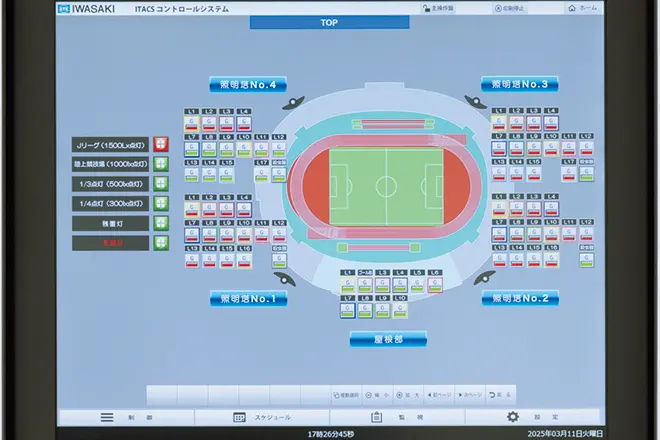 照明制御システムについては、全ての操作・設定をグラフィックタッチパネルで簡単に行えると同時に、あらかじめ設定した照明パターンをタブレット操作で管理室からも遠隔制御が可能となる「ITACS-LC(アイタックス エルシー)」を導入いただきました。用途や各競技種目の照度レベルに応じて適切な点灯パターン制御を行い、施設運営の利便性向上に貢献しています。