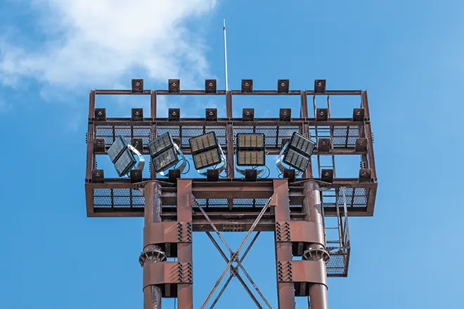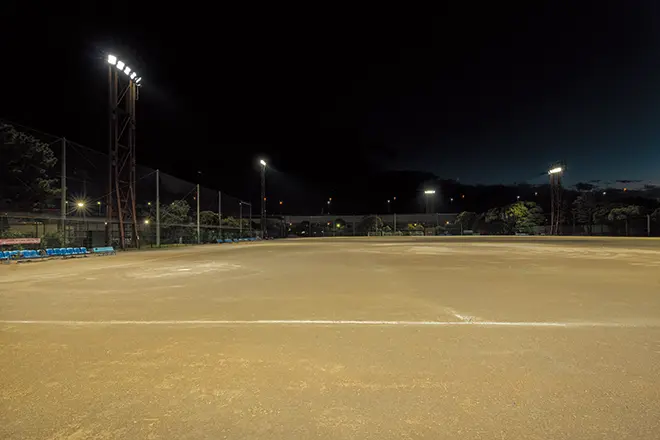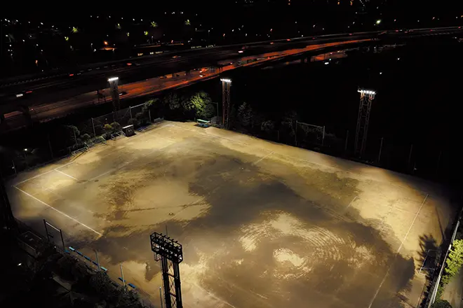 横浜市では、2024年3月に運動広場のナイター照明設備をLED化する改修工事を実施しました。この運動広場は、野球だけでなく、サッカーやラグビーなどの多目的利用が可能な施設です。LED化にあたっては、緑豊かな自然に恵まれた周辺環境のほか、隣接する高速道路や住宅地に配慮し、上空や周辺への漏れ光を抑えながら快適なプレー環境を確保することが重要課題でした。これらの条件を満たす照明として、周辺環境への配慮とプレーしやすい照明環境を両立する「光害対策形 LED投光器」をご採用いただきました。既設鉄塔を活用して投光器のみをLEDに更新し、省エネ推進と質の高いナイター照明環境を実現しています。