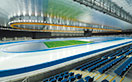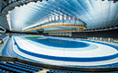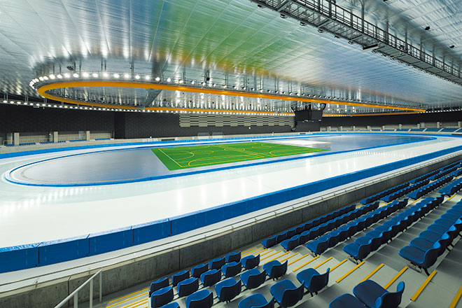 八戸市長根屋内スケート場(YSアリーナ八戸)は、スケートやアイスホッケーが盛んな「氷都八戸」の新たな拠点として、青森県八戸市に誕生した屋内スケート場です。国際大会が開催できる屋内スケート場として国内で3例目となる同施設は、ランニングコストの低減に配慮し、世界最高水準の競技環境を目指した“世界水準の屋内スケート場”であり、スケートをはじめさまざまなスポーツや地域住民の日常的な交流活動、イベントなど多目的な利用が可能な“みんなの屋内スケート場”、そして災害時には“地域防災拠点の屋内スケート場”としての役割も果たす大型競技施設です。約14,000m²の広さを持つアリーナには、国際規格の400mダブルトラック(16m幅)のスケートリンクを中心に、リンク内側にはフットサル用人工芝を敷いた約33m×42mの競技面と、バスケットボールやバレーなどに使用できる約33m×42mの多目的コート、さらに約16m×16mのサブリンク1面を備えています。また、リンク外周には幅1.55m×2レーンのランニングコースがあり、固定観客席は約3000席ですが、解氷時にコンサートやコンベンションなどイベント会場としてアリーナを活用する際には最大9000席まで収容が可能となり、トレーニングルームや会議室なども完備した、1年を通して多目的な利用が可能な施設です。