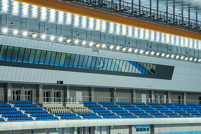 使用器具は全て調光対応とし、スピードスケート以外にもさまざまなスポーツ競技やイベントなど多目的用途に使用されるアリーナを適切な光で照らし、即点灯・照度の調整が可能ですので臨機応変に利用者のご要望にお応えすることができます。各種点灯パターンに対応する照明制御は遠隔監視できる機能を有し、器具及び電源はキャットウォークに取り付けられているため、メンテナンス性も良好です。照明器具の選定に始まり、グレア対策、適切な設定照度、照射角度など綿密に照明設計を行うことで、均斉度・演色性の高い光でアリーナの大空間を快適に照らし、世界水準の屋内スケート場にふさわしい質の高い照明環境をつくることができたと考えています。