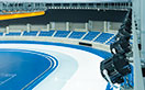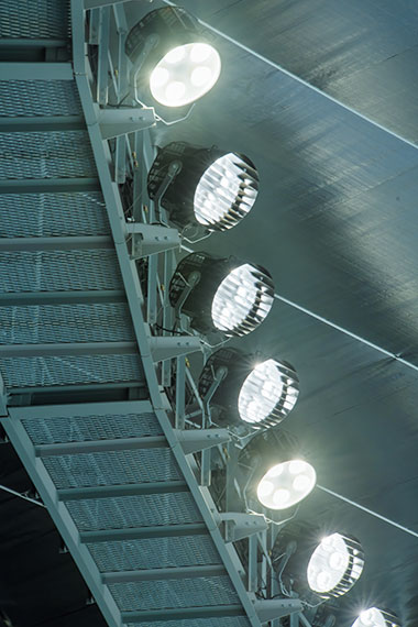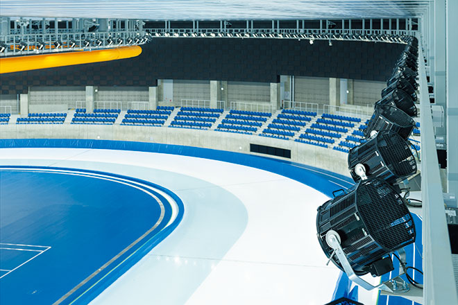 ホームストレート側をメインスタンドとし、その両側にコーナー席を設けた馬蹄形の観客席を特長とするアリーナを照らす照明設備については、アスリートファーストの理念に基づき、均斉度及びグレア対策を十分考慮しながら小形・高出力のLED投光器「レディオック フラッド デュエル 830Wタイプ・1100Wタイプ」をトータルで550台設置し、世界最高水準とするため水平面維持平均照度1500ℓx以上(旧JIS照度基準)としつつ、均斉度についてはより良好な競技環境とするためJISスポーツ照明基準の0.7以上を採用するなどこの施設独自の設計基準を定め、鉛直面維持平均照度1000ℓx以上、均斉度0.5以上(JISスポーツ照明基準TV対応)を確保しています。また、設置場所に応じて遮光ルーバ付を使用し、さらに、光による氷上の反射障害を回避するため、競技者の背面(滑走方向側)より斜め前方に向けた照射を行い、その結果大幅なグレア軽減を実現しました。滑走面はどの照度レベルも一律均斉の取れた照明環境が構築されているため、利用者は快適に練習及び競技を行うことができます。