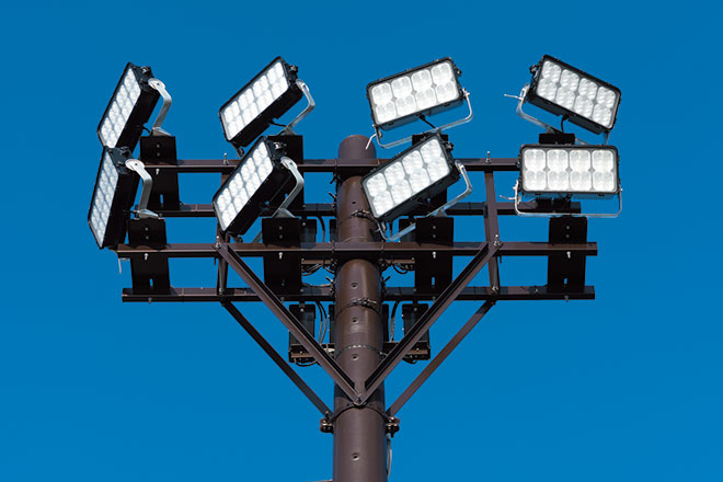2019年6月に実施したリンク照明設備改修については、照明のLED化による省エネ推進とアイスリンクとしての運用性向上はもちろん、照明器具配置場所の変更により夏季イベント利用時の収容人数増加を図るという敷地の有効活用や周辺への漏れ光の軽減など、諸条件をクリアすることを目的として照明計画を進めました。そして、これまでリンク内の中央に設置していた照明鉄塔からの投光照明という手法に替えて、外周に設置した照明ポールからの投光照明とし、LED投光器「レディオック フラッド ゼスト」をトータルで83台採用しました。冬季はスピードスケート大会などで長期間使用することから、まぶしさへの対策には特に留意のうえ、“まぶしく見える角度が従来よりも少ない”ことを特長とする同器具を設置し、スケーターの後方からの追跡照明とすることで、明るさを向上させながらまぶしさを抑えた高次元の照明環境を創出することができました。また、中央にあった照明鉄塔を撤去したことによりイベント時の最大収容人数も増加し、より有効に敷地を活用することができるようになり、高さ約25mの既設照明塔を12mの照明ポールに替えて外周からリンクを照らすことで周辺への漏れ光も抑えています。