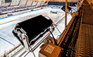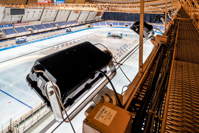 長野市では、2022年3月に照明設備をLED化する改修工事を実施し、アリーナ両サイドと天井面に設置されていた既設メタルハライドランプに替えて、発光面のまぶしさを抑えた器具設計を特長とする高効率・高演色形LED投光器「レディオック フラッド ゼスト シンプルモデル 500クラス」に更新しました。メタルハライドランプ1kW相当の明るさを持つ500クラスをご採用いただいたことにより、既設と同等以上の明るさを設定しながら灯数を減らすことができ、大幅な省エネを実現しています。