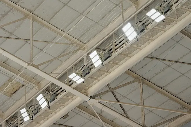 東伏見アイスアリーナでは、2024年6月から10月にかけて休館し、アイスリンクを解氷するなどの修繕工事を実施、同年11月1日から通常営業を再開しました。今回の修繕工事に伴い、アイスリンクを照らす照明設備についてもリニューアル工事を行い、LED照明に更新しました。既設メタルハライドランプ700W×215台に替えて、高効率形のLED投光器「レディオック フラッド アヴァン 屋内用 400クラス」80台をご採用いただき、設置台数・消費電力の大幅削減を実現しつつ、良好な照明環境を創出しました。