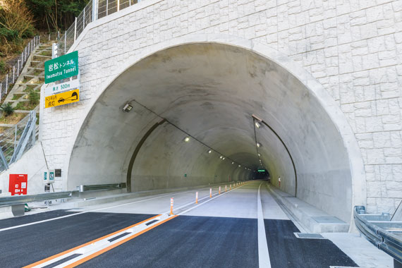 愛媛県宇和島市で整備を進めてきた一般国道56号宇和島道路の津島高田インターチェンジ(IC)~津島岩松IC間3.5kmが2015年3月に開通し、全線17.5kmが完成しました。松山自動車道や国道56号などと連携することにより、広域的なネットワークを形成するとともに交通混雑緩和、また災害時の代替路線確保など大きな役割を担う自動車専用道路です。今回開通した区間に位置する岩松トンネルは、四国のトンネルでは初めてとなる照明のオールLED化を実現した延長500mのトンネルです。