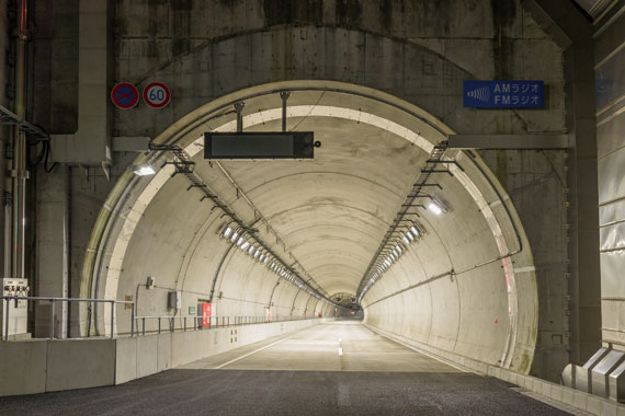 トンネル内を安全に照らす照明設備には、トンネル照明・避難通路など全てにLED照明を採用することにより、環境負荷の低減、省エネを実現しています。本トンネルの入口照明部の制御は、4段調光を採用し、明るさ及び均斉度を保持したまま斑にならないようにすることで、ドライバーの疲労感を軽減させ、安全性に十分留意した照明環境を創出しました。