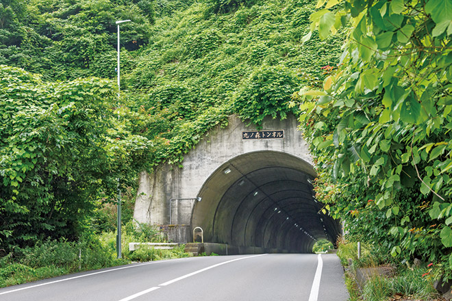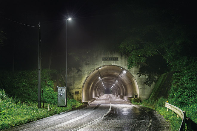 緑が茂る九の森トンネルは木々に覆われ、森の中を走っているような幻想的な感覚になるトンネルで、抗口に設置されたLED道路灯「レディオック ロード」と、トンネル内5mの高さに設置されたLEDトンネル用照明器具「レディオック トンネル」が入口及びトンネル内を明るく照らし、ドライバーに安全で快適な照明環境を提供しています。