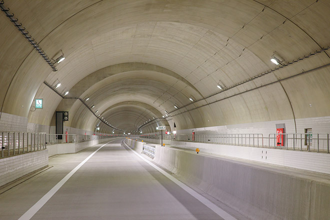 各トンネルの照明器具には、大幅な省エネ・省メンテナンスに貢献し安全にトンネルを照らす光として基本照明、入口照明ともにLED照明が採用されました。基本照明は50%・25%調光仕様、入口照明は75%・50%・25%調光仕様とし、時間帯に応じて適切な明るさに調光することも可能で、トンネルを走行するドライバーに安全かつ快適な視環境を提供しています。