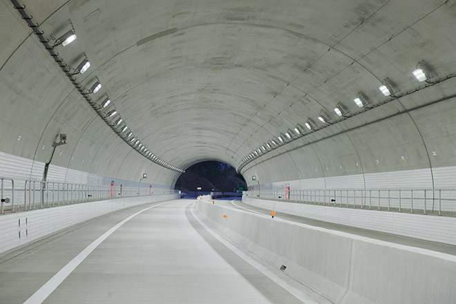 各トンネルの照明器具には、大幅な省エネ・省メンテナンスに貢献し安全にトンネルを照らす光として基本照明、入口照明ともにLED照明が採用されました。基本照明は50%・25%調光仕様、入口照明は75%・50%・25%調光仕様とし、時間帯に応じて適切な明るさに調光することも可能で、トンネルを走行するドライバーに安全かつ快適な視環境を提供しています。