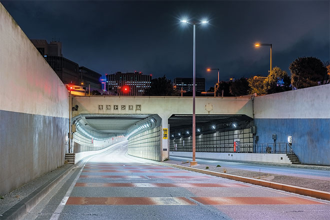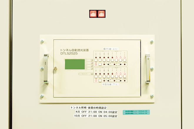 電気室内の分電盤の更新に伴い自動調光装置も更新し、基本照明を調光3段階(100%、50%、32%)、入口照明を調光4段階(100%、75%、50%、25%)仕様と、細かく調光運用することで時間帯に応じて適切な明るさに制御し、トンネル内を走行するドライバーに安全で快適な視環境を提供しています。坑外灯についても、LED化を図り、LED道路灯「レディオック ロード」をご採用いただきました。