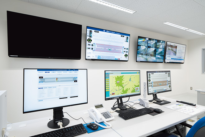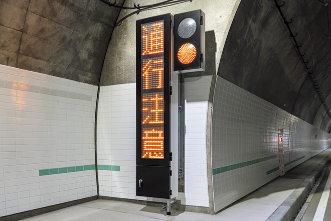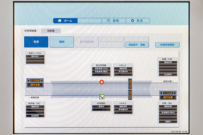 非常設備は遠方監視制御装置との接続のほか、建設事務所内の受信制御機にも接続し、二重で監視、制御を行うことで冗長化を図り、地元の皆さまの利便性向上に寄与する新しいバイパスのトンネルを、明るく安全に照らしています。