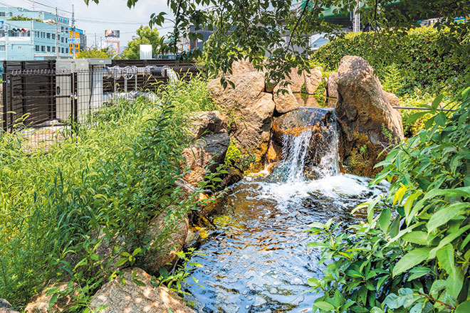 このような背景のもと、豊中市では下水道事業を「まちづくり」の重点政策として取り組んできた経緯があり、その中で「利水」「治水」だけではなく、「親水」も考慮した親水水路事業の一環として下水処理場の高度処理水を水源とする人工の“せせらぎ”がある新豊島川親水緑道を整備しました。しかしながら、薬品殺菌の影響で水生生物が生育できない環境であったことから、これに代わる紫外線流水殺菌装置「ステリアイW」を導入した結果、水質が改善され、カワムツやモクズガニなどの水生生物が増え、家族で水辺を楽しむ姿が見られるようになりました。紫外線による水殺菌は、薬品殺菌のように水質に影響を与えないため、クリーンな殺菌をきわめて合理的かつスピーディに行えることを特長としています。