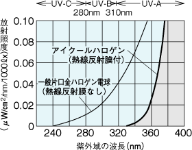 アイ クールハロゲンは、外球への赤外線反射膜塗布により、熱線とUV(紫外放射)を大幅に低減。変退色などの熱やUVによる照射物への影響を抑制します。