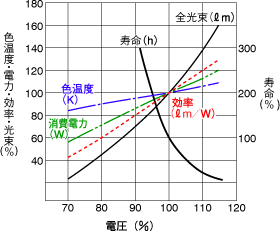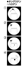 - ハロゲン化タングステンは高温フィラメント付近で分解して、ハロゲン物質は管壁に再び拡散し、タングステンはフィラメントに戻り、寿命末期までバルブが黒化しにくく光束の低下を防ぎます。W+2X←WX₂(逆反応)