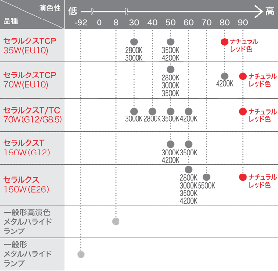 ハロゲン電球に近似した暖白色の2800Kと電球色光の3000K、特に赤色が映える温白色光の3500K、爽やかな白色光の4200K、昼白色の5500K、幅広い用途に使用することができます。
