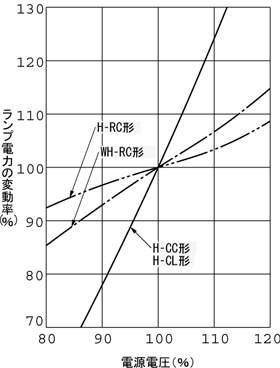 電源電圧が変動するとランプ電力、ランプ光束などの諸特性が変化します。その変化する程度は、ランプの種類と使用する安定器によって異なります。電源電圧が低いと始動が不安定だったり、ランプが立ち消えになる心配があります。また、電圧が高いとランプや安定器の寿命が短くなりますので、できる限り電源電圧は定格の±6%の範囲内で使用する必要があります。