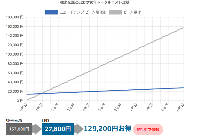 - ※1:ビーム電球150W形の消費電力は120W、定格寿命は2000時間、ランプ代(税抜)は、1,850円にて算出。