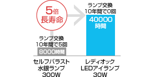 LEDが発する熱を効率よく放熱する新規設計により、定格寿命40000時間を達成。セルフバラスト水銀ランプと比較し、約5倍長寿命で、省メンテナンスです。