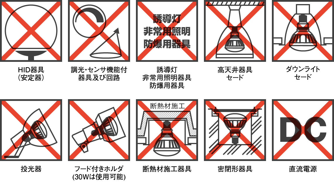- HIDランプ用器具(安定器二次側)、非常用照明器具、誘導灯器具、防爆用器具では絶対に使用しないでください。ランプの破損、発煙又は点灯回路損傷のおそれがあります。