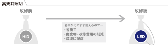 高天井用照明でも、既設ランプ・安定器→LEDランプ・電源ユニットの交換だけでLED化が可能。