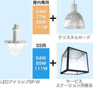 LEDアイランプSP-Wは、前面グローブを縦に広げ、直下だけではなく横方向へも光が広がる構造になっています。クリスタルセードやサービスステーション用器具に取付けた場合、従来と変わらないセードの輝きと空間の明るさを実現します。