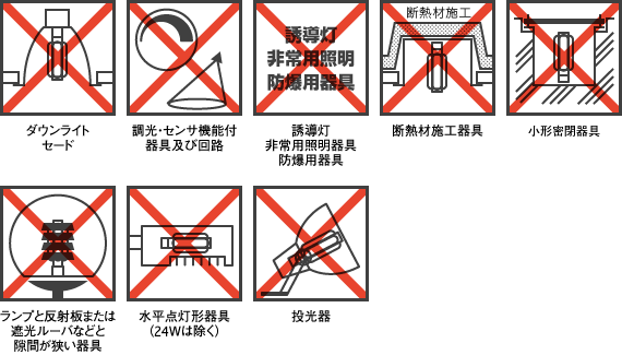 - 調光機能の付いた照明器具及び回路では使用できません。不点灯や短寿命のおそれがあります。