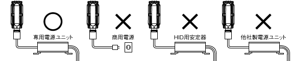 - 専用の電源ユニット以外では絶対に使用しないでください。ランプの破損、発煙又は点灯回路損傷のおそれがあります。