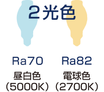 色温度は水銀ランプ(蛍光形)より爽やかな印象の5000K(昼白色)と、あたたかな印象の2700K(電球色)、2100K(ナトリウム色)をラインアップしています。(15Wのみ)