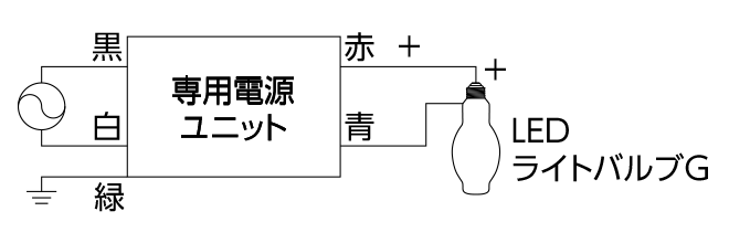 ※LEDライトバルブGは直流点灯です。必ず専用電源ユニットと組合わせてご使用ください。(商用電源や安定器の二次側に直接接続しないでください)