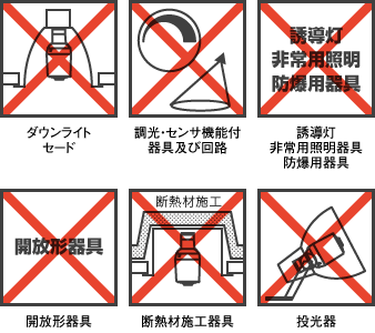- 調光機能(100%点灯でも使用不可)や遅れスイッチ及びセンサライトには使用できません。不点灯や短寿命の原因となります。