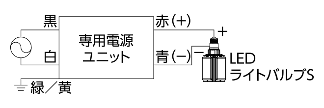 - ※LEDライトバルブSは直流点灯です。必ず専用電源ユニットと組合わせてご使用ください。(商用電源や安定器の二次側に直接接続しないでください)