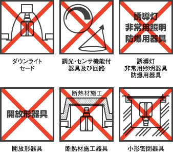 - 調光・センサ機能の付いた照明器具及び回路(100%点灯でも使用不可)