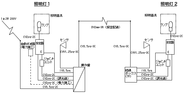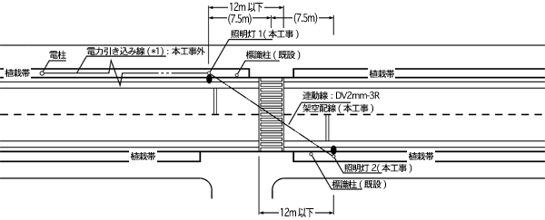 照明灯の配置は,基本方式として横断者を逆シルエット視するため,車の停止線側に建柱した。建柱位置は人感センサの感知範囲から横断歩道の中心から約7.5mとし,最大でも横断歩道の端部から12m以内とした。横断歩道の両端いずれの位置でも横断者を感知し,2基の照明柱が同一調光を行なうため架空での連動線を設けた。