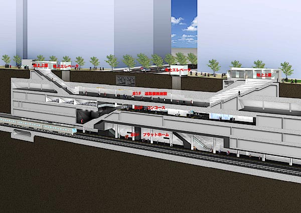 プラットホーム階(地下5階)は,スピード感がある水の流れ,コンコース階(地下2階)は,カーブした水の流れを表現している。また,道路横断施設階(地下1階)は,水の中から見た水面,地上上屋は,全面ガラスとして水面を表現している。