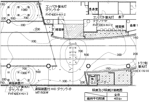 改札口・券売機前は,設計照度を確保するために改札口には,コンパクト蛍光ランプ42W×2(5000K)ダウンライトを人の通過位置に設置し,券売機前には,コンパクト蛍光ランプ32W×2(5000K)ダウンライトを人の立ち位置真上に設置している。改札口付近の照度分布図(維持)を図6に示す。