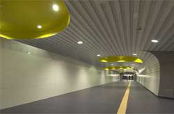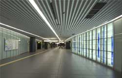 コンコース階の照明は,プラットホーム階と同様の基本照明としている。また,アクセントとしてカーブした壁面沿いにHf蛍光ランプ32W×1灯用(5000K)建築化照明を設置している。(図5)