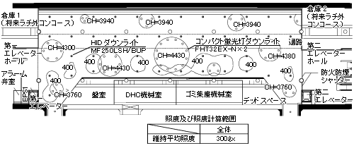道路横断施設階の照明は,基本照明としてメタルハライドランプ250W(4200K)ダウンライトを設置し,天井部の大小さまざまな円形部分には,瞬定点灯を兼ねたコンパクト蛍光ランプ32W×2(5000K)ダウンライトが設置されている。図7に道路横断施設階の照度分布図(維持)を示す。