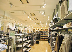 無印良品の照明計画では,壁面と一部のステージやレジ以外は基本的にベース照明だけで賄っている。これは,什器の配置換えが多い為に什器当ての照明を設置しても,その後の配置換えにより,あまり意味をなさなくなってしまうからである。その為,ベース照明は配光をやや広めにすることで鉛直面照度を補い,什器自体が作ってしまう影で商品が暗くなるのを極力防いでいる。ベース照明は各店舗の天高や天井のタイプ,周囲の照度などによって違ってくるが,セラルクス®150WかFPL蛍光ランプを使用している。設定照度は,ベース照明しかないことを考慮し,やや明るめの1300ℓx(机上面,維持照度)を目安として設計している。