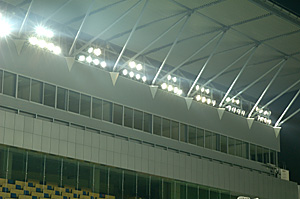 器具取り付け高さの高いメインスタンドおよび照明鉄塔からの走路用照明は,ビーム効率の高い照明器具を使用した手法が効果的なので,パワービーム™にクウォーツアーク®・ショートアーク2kWを使用し,走路の水平面照度を確保している。(図2)照明鉄塔は最下段高27m・67灯用×2基と47灯用×2基をバックストレッチ外側に設置した。