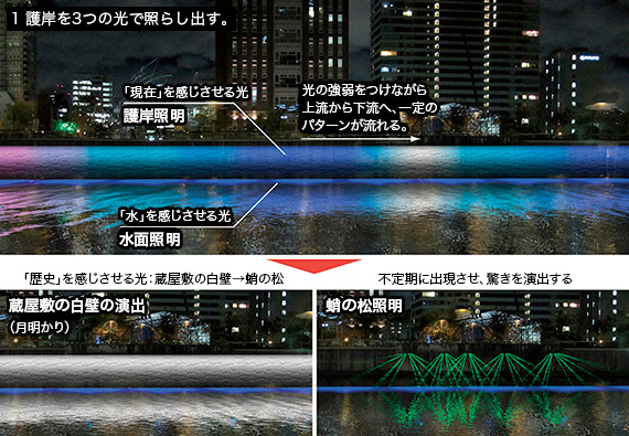 「歴史」を感じさせる要素を光で演出する。モチーフに江戸時代の「蔵屋敷の白壁」と現在は移設されている「蛸の松」を光で表現する。護岸照明で白色(月明りの壁面)を創り出す。蛸の松のもとあった護岸中央の張出部下に緑色の光(スリット光)で松を創り出し,古の情景を現代的に表現する。常時点灯するのではなく,通常時の演出の中に不定期に織り交ぜ,特別性,驚きを創る。