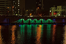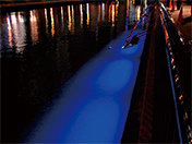「水」を感じさせる青色の光で演出する。水面を直接光で照らし,波の立ち方,水位により見え方が変化し,常に動きのある景観を創る。水際を照らすことで陸上と川,夜景と映り込みを繋ぎ,水面が青く照らされるため対岸,歩道側で水辺の雰囲気を創り出す。一定の間隔で連続配置とし,波を表現している。