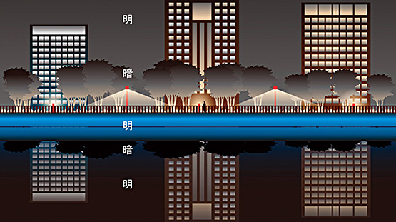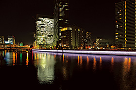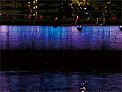 「現在」を感じさせるフルカラーの光で演出する。現在の多様性,再開発の発展性に合わせ,明るさ,色を変化させられる光で,景観で一番目立つ護岸を演出する。通常時は一定のパターンで演出し,緩やかに動きをつける。イベント時には通常時と異なる,時間,季節,イベントに合わせた演出に変化させ,特別性を演出する。護岸を均一に照らすためラインで配置する。