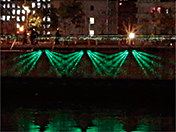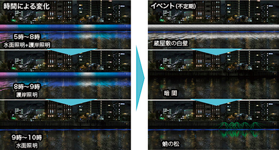 季節,時間により変化させることで「おどろき」を創り,飽きの来ない「おもてなし」の空間を創出している。水面・護岸照明は,常時の演出の「水」をイメージした演出とし,「青色」を基調とした光のグラデーションを上流から下流にかけて徐々に光を変化させ,流れているイメージを創り出している。また,季節を表現した演出パターンを毎正時(30分毎)に出現させ,時間の共有を図っている。クリスマス時期にはイベントパターンを表示し,より地域に属した演出となっている。