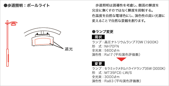 護岸周辺の既設歩道灯(ポールライト,アプローチ)道路灯の余分な輝度を抑制し夜景を整理している。再開発地域の夜景が目立つようになり,照明器具の水面の映り込みを低減させ,自然な景観を創り出す。また,歩道部では,演色性のよい光源に変更し,自然な視環境を創り植物の表情を正確に表現している。