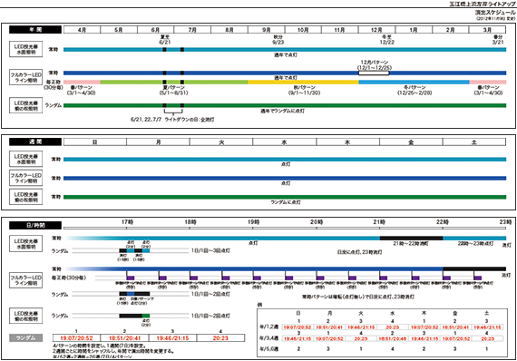 フルカラーLEDライン照明の演出パターンを変化させ,四季に合わせた演出パターンとなっている。