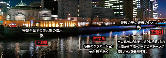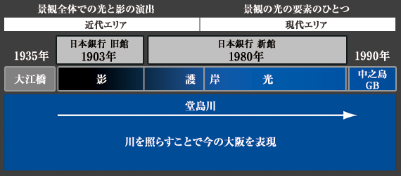 近代を感じさせる演出として「光」と「影」のコントラストを全体の景観で創り出すことで,近代の演出とする。現代建築などの特徴として,幾何学,面といった特徴があり,光としても面やラインといった繋がりを感じさせる光が現代を象徴する。また,光色もロウソクの光や電球の光とは異なった自然では無い光色が現代を感じさせ,最近では技術の進歩として,変化のある光が象徴となっている。様式の変化や技術の進歩は街の景観をめまぐるしく変化させていく中で,川は唯一普遍的な要素である。そういった自然景観は人々に安心や落ち着きをもたらし,人々を引きつける。そこで,「水」の表情,流れの変化を夜間景観に浮かび上がらせることで「自然」を感じさせ,魅力的な景観を創り出すと共に,景観全体,近代と現代の架け橋となるよう,水への映り込みをいかした照明計画とする。